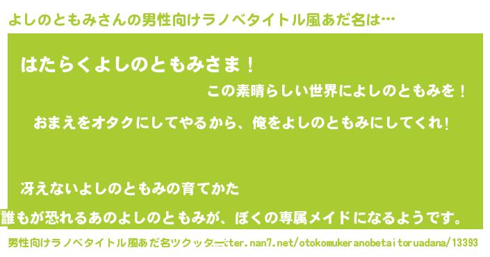 | 女子向けラノベタイトル風あだ名 | 『よしのともみ夫妻のなれそめ』 |