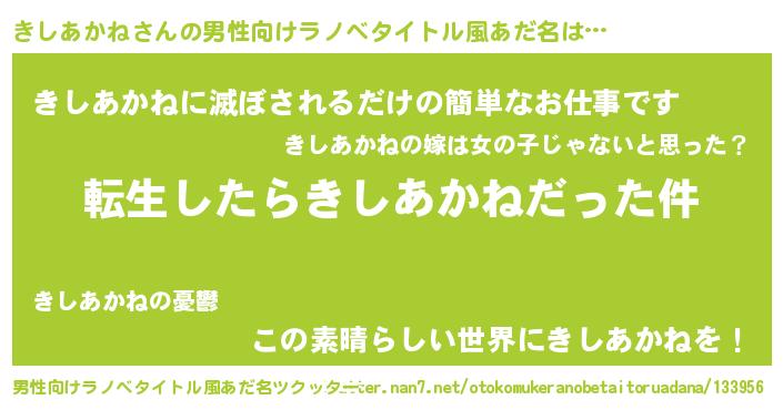 | 女子向けラノベタイトル風あだ名 | 『きしあかねの玉の輿計画!』 |
