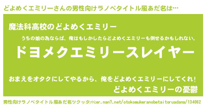 | 女子向けラノベタイトル風あだ名 | 『婚約破棄系悪役どよめくエミリーに転生したので、保身に走りました。』 |