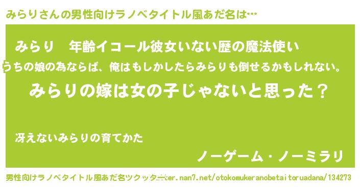 | 女子向けラノベタイトル風あだ名 | 『みらり様がみてる』『死神みらりの再婚』 |