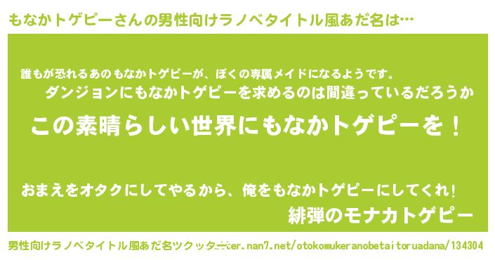 | 胡散臭い通販商品みたいなあだ名 | 『あなたにだけ特別に提供する100年もののヴィンテージワイン…その名も「もなかトゲピー」』 |