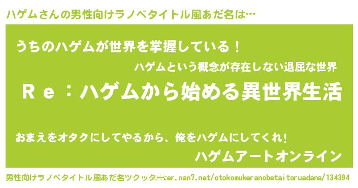 | 女子向けラノベタイトル風あだ名 | 『闇のハゲム』『男装ハゲムの憂鬱な任務』 |