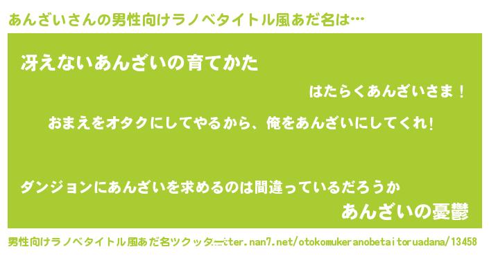 | 女子向けラノベタイトル風あだ名 | 『あんざい夫妻のなれそめ』 |