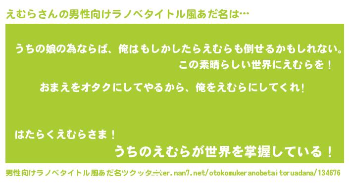 | 女子向けラノベタイトル風あだ名 | 『えむら夫妻のなれそめ』 |