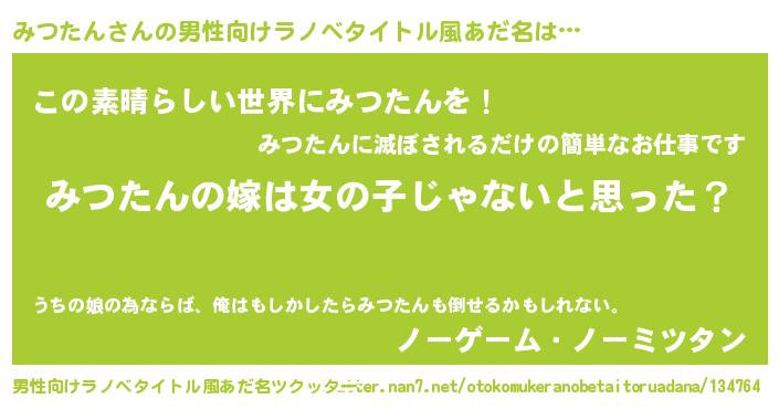 | 女子向けラノベタイトル風あだ名 | 『みつたんの卵を拾いまして』 |