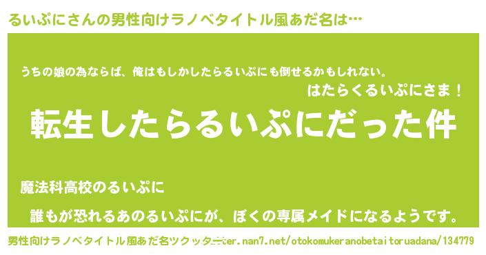| 女子向けラノベタイトル風あだ名 | 『るいぷにの玉の輿計画!』 |