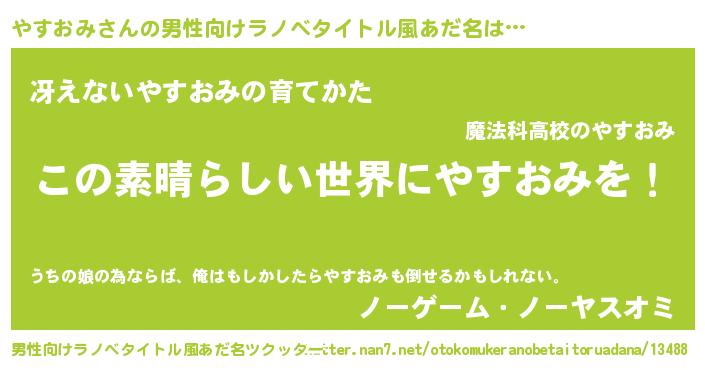 | 胡散臭い通販商品みたいなあだ名 | 『あなたにだけ特別に提供する100年もののヴィンテージワイン…その名も「やすおみ」』 |