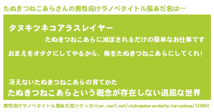 | 女子向けラノベタイトル風あだ名 | 『たぬきつねこあら夫妻のなれそめ』 |