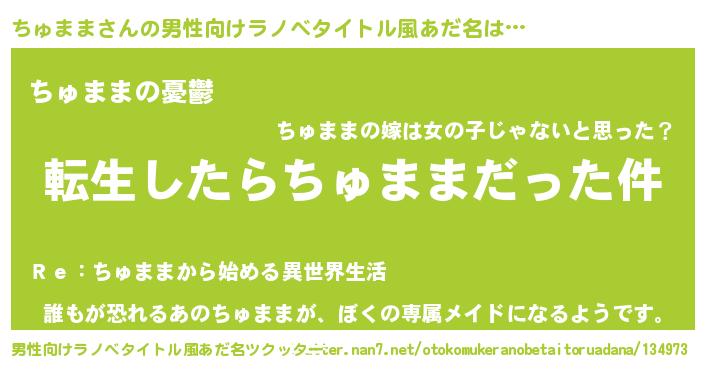 | 女子向けラノベタイトル風あだ名 | 『ちゅままの玉の輿計画!』 |