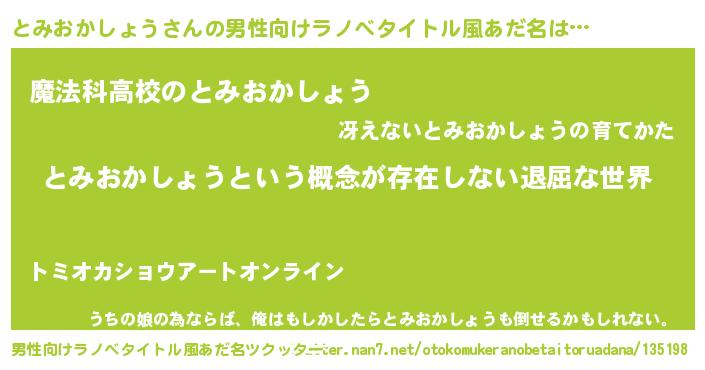 | 女子向けラノベタイトル風あだ名 | 『異世界で失敗しない100のとみおかしょう』 |