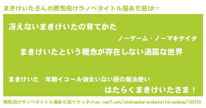 | 女子向けラノベタイトル風あだ名 | 『異世界で失敗しない100のまきけいた』 |