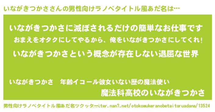| 胡散臭い通販商品みたいなあだ名 | 『絶対に幸福をもたらす水素水…その名も「いながきつかさ」』 |