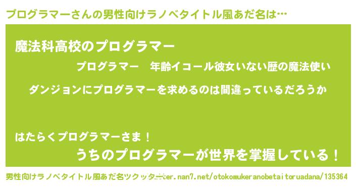| 胡散臭い通販商品みたいなあだ名 | 『信頼と実績のサプリメント…その名も「プログラマー」』 |