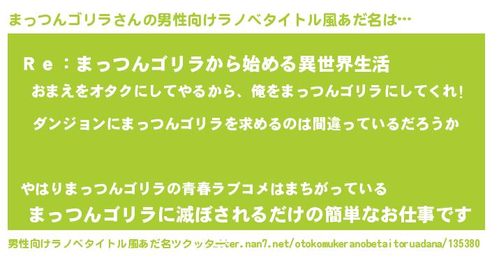 | 女子向けラノベタイトル風あだ名 | 『まっつんゴリラの卵を拾いまして』 |