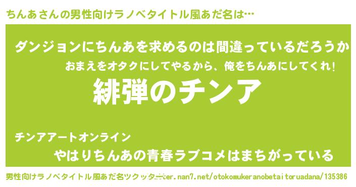 | 女子向けラノベタイトル風あだ名 | 『シンデレラちんあ家の靴箱館』 |