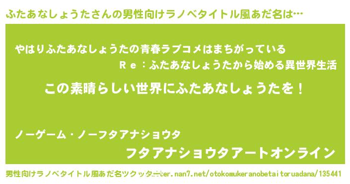 | 女子向けラノベタイトル風あだ名 | 『悪役ふたあなしょうたに転生したようですが、知った事ではありません』 |