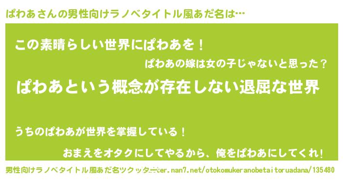 | 女子向けラノベタイトル風あだ名 | 『異世界で失敗しない100のぱわあ』 |