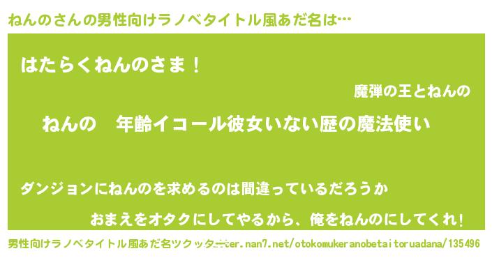 | 女子向けラノベタイトル風あだ名 | 『ねんのの玉の輿計画!』 |
