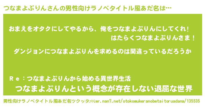 | 女子向けラノベタイトル風あだ名 | 『つなまよぷりんの卵を拾いまして』 |