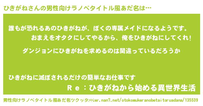 | 女子向けラノベタイトル風あだ名 | 『ひきがねの卵を拾いまして』 |