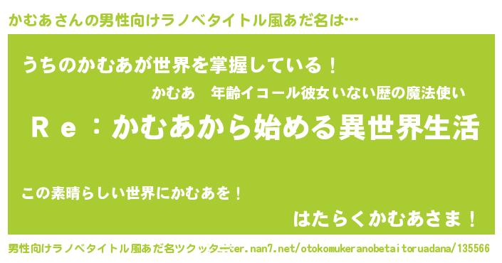 | 女子向けラノベタイトル風あだ名 | 『闇のかむあ』『男装かむあの憂鬱な任務』 |
