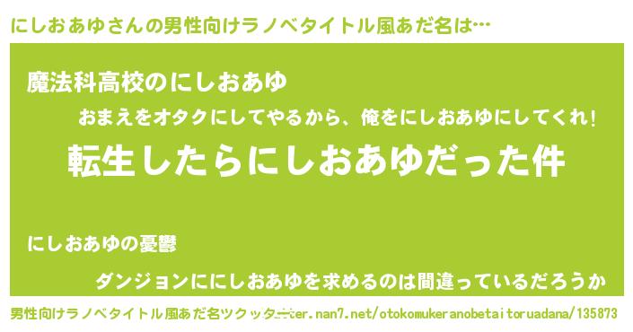 | 女子向けラノベタイトル風あだ名 | 『にしおあゆの玉の輿計画!』 |
