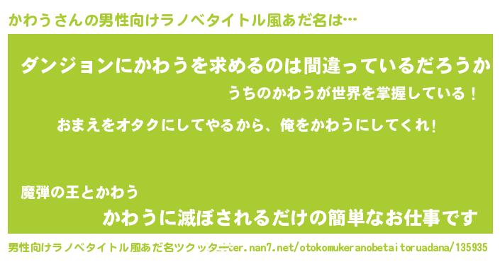 | 女子向けラノベタイトル風あだ名 | 『かわう夫妻のなれそめ』 |