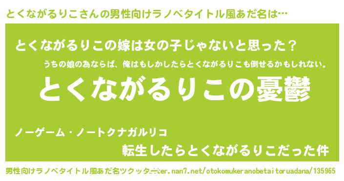 | 女子向けラノベタイトル風あだ名 | 『(仮)とくながるりこのやんごとなき事情』 |