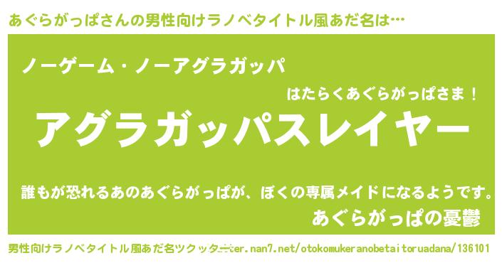 | ヘコむあだ名 | 『あぐにゅー』『あぐらがっぱ(遠い目)』 |
