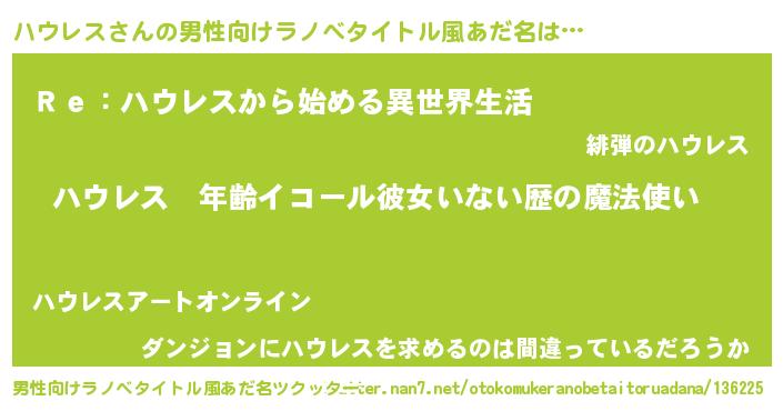 | 女子向けラノベタイトル風あだ名 | 『ハウレスの玉の輿計画!』 |