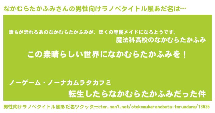 | 女子向けラノベタイトル風あだ名 | 『悪役なかむらたかふみに転生したようですが、知った事ではありません』 |