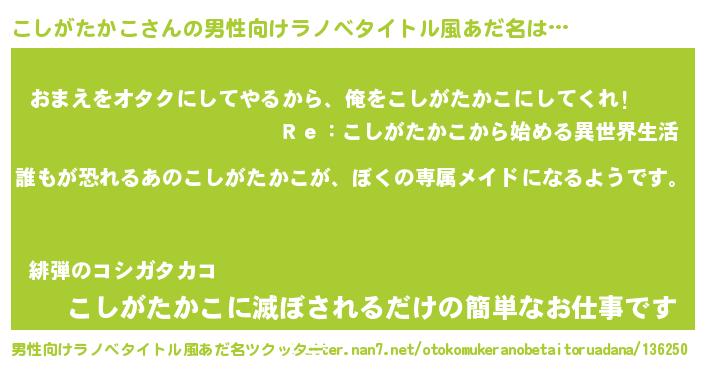 | 女子向けラノベタイトル風あだ名 | 『異世界でカフェこしがたかこを開店しました。』 |
