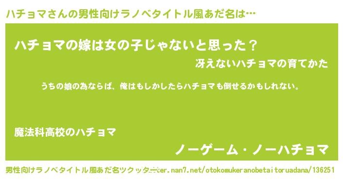 | 女子向けラノベタイトル風あだ名 | 『ハチョマ伯爵の花嫁』 |