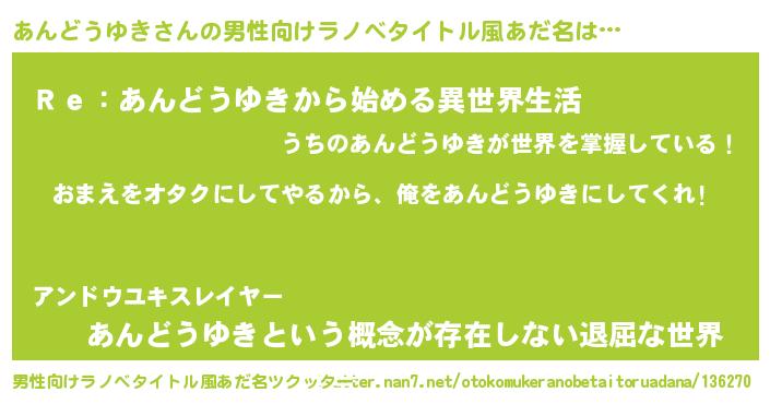 | ヘコむあだ名 | 『あんどうゆき(笑)』『あんふぇ~』 |
