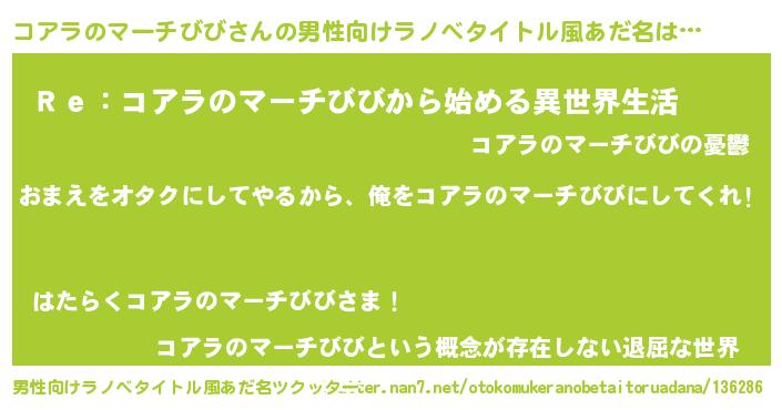 | 女子向けラノベタイトル風あだ名 | 『コアラのマーチびび夫妻のなれそめ』 |