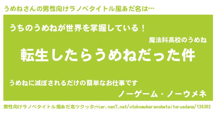 | 女子向けラノベタイトル風あだ名 | 『婚約破棄系悪役うめねに転生したので、保身に走りました。』 |