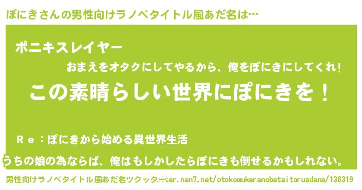 | 胡散臭い通販商品みたいなあだ名 | 『あなたにだけ特別に提供する100年もののヴィンテージワイン…その名も「ぽにき」』 |