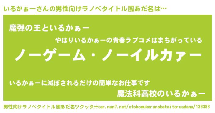 | 女子向けラノベタイトル風あだ名 | 『死神いるかぁーの再婚』 |
