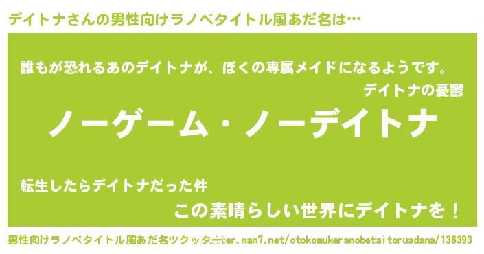 | 女子向けラノベタイトル風あだ名 | 『死神デイトナの再婚』 |