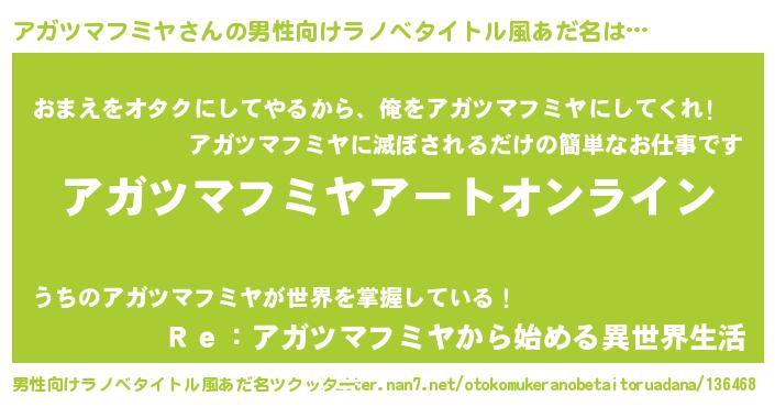 | 女子向けラノベタイトル風あだ名 | 『誰かこのアガツマフミヤを説明してください! ~契約から始まるウェディング~』 |