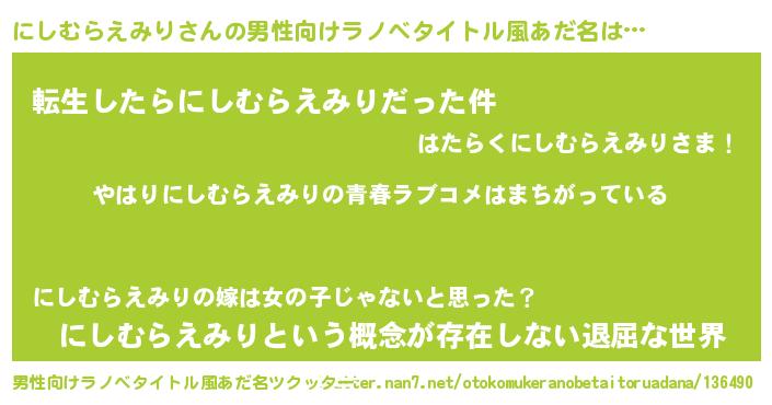 | 女子向けラノベタイトル風あだ名 | 『にしむらえみりの雑貨屋さん』 |