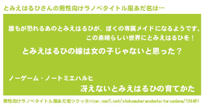 | 女子向けラノベタイトル風あだ名 | 『とみえはるひの卵を拾いまして』 |