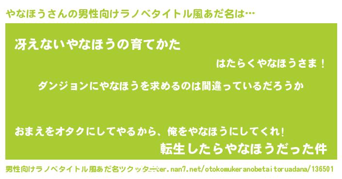 | 胡散臭い通販商品みたいなあだ名 | 『信頼と実績のサプリメント…その名も「やなほう」』 |