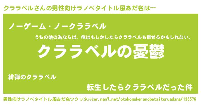 | 女子向けラノベタイトル風あだ名 | 『(仮)クララベルのやんごとなき事情』 |