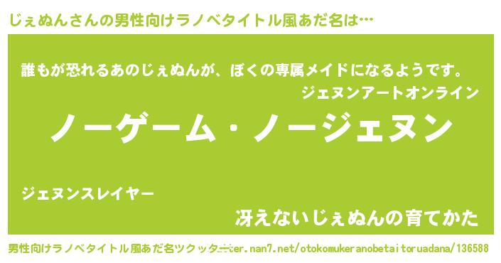 女子向けラノベタイトル風あだ名 | 『死神じぇぬんの再婚』 |