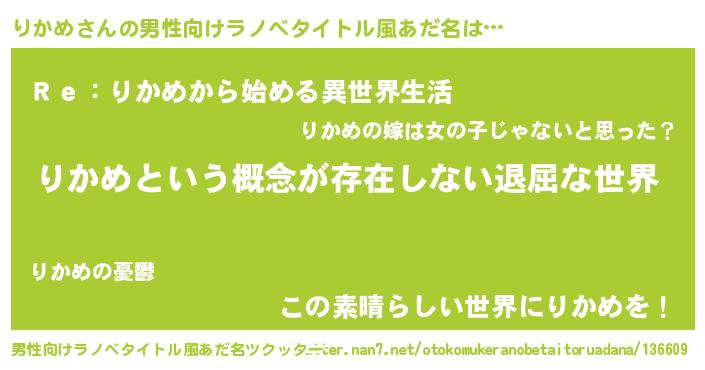 | 女子向けラノベタイトル風あだ名 | 『りかめの契約王妃』『闇のりかめ』 |