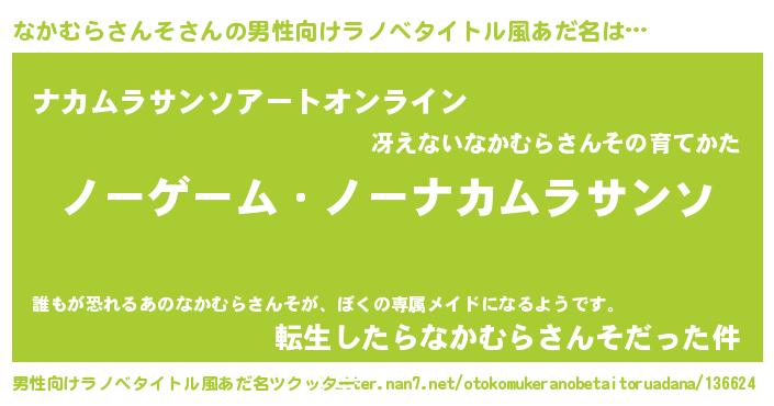 | 女子向けラノベタイトル風あだ名 | 『死神なかむらさんその再婚』 |
