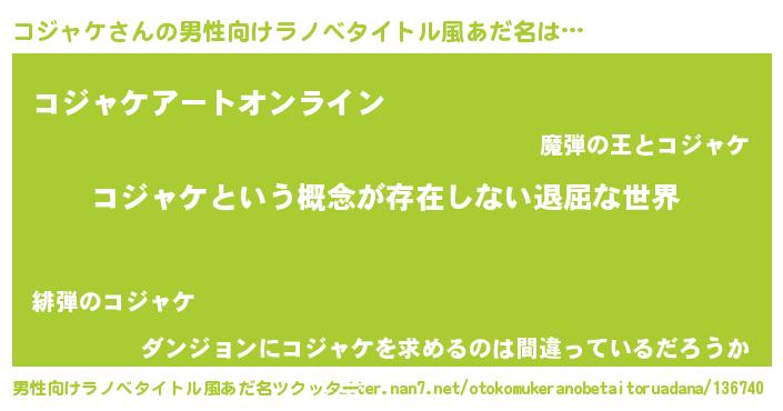 | 女子向けラノベタイトル風あだ名 | 『異世界で失敗しない100のコジャケ』 |