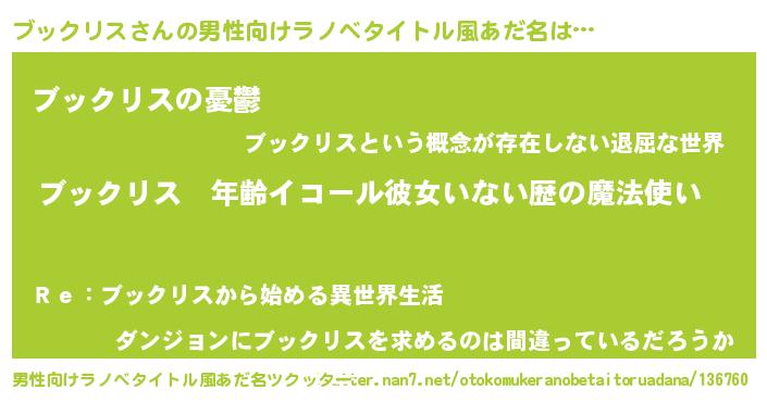 | 女子向けラノベタイトル風あだ名 | 『ブックリスの玉の輿計画!』 |