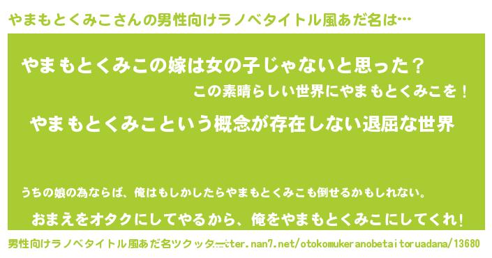 | 女子向けラノベタイトル風あだ名 | 『異世界で失敗しない100のやまもとくみこ』 |